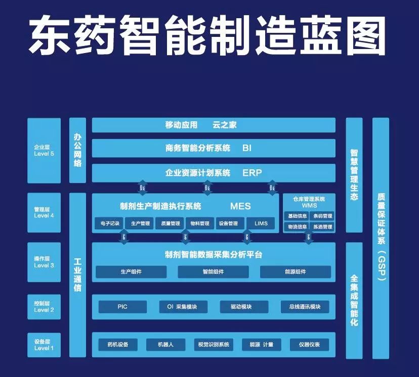 再就是上面搭的制造執(zhí)行系統(tǒng),包括電子批錄、生產(chǎn)管理、配方、過程質(zhì)量管理、物料管理等。這里面重要的部分就是把藥品的電子記錄部分優(yōu)先做出來,因為它是符合GMP合規(guī)性重要的一部分。當然還有實驗室管理系統(tǒng),這次智能改造的時候,我們會把倉庫完全變成智能倉庫,和數(shù)據(jù)打通。
